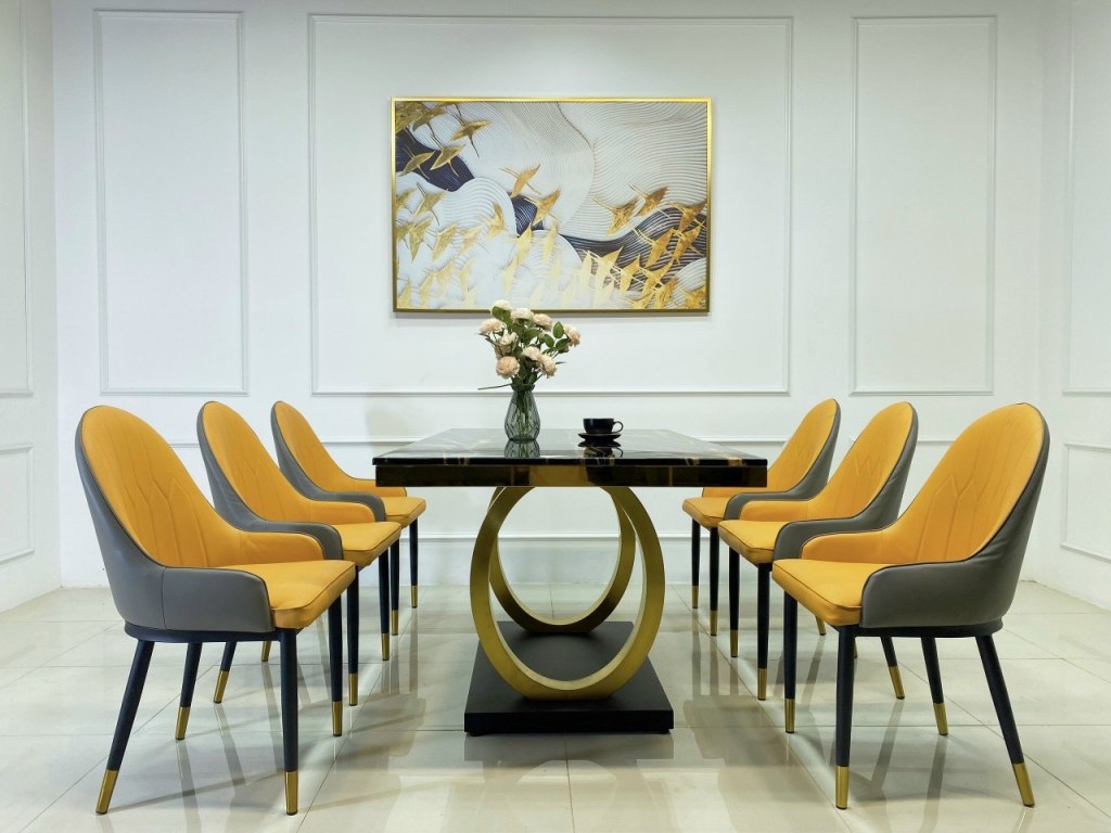 - Bàn ăn chân mạ PVD, mặt đá Ceramic bóng nhập