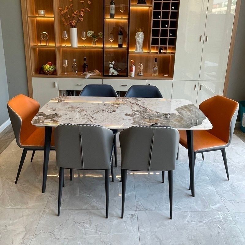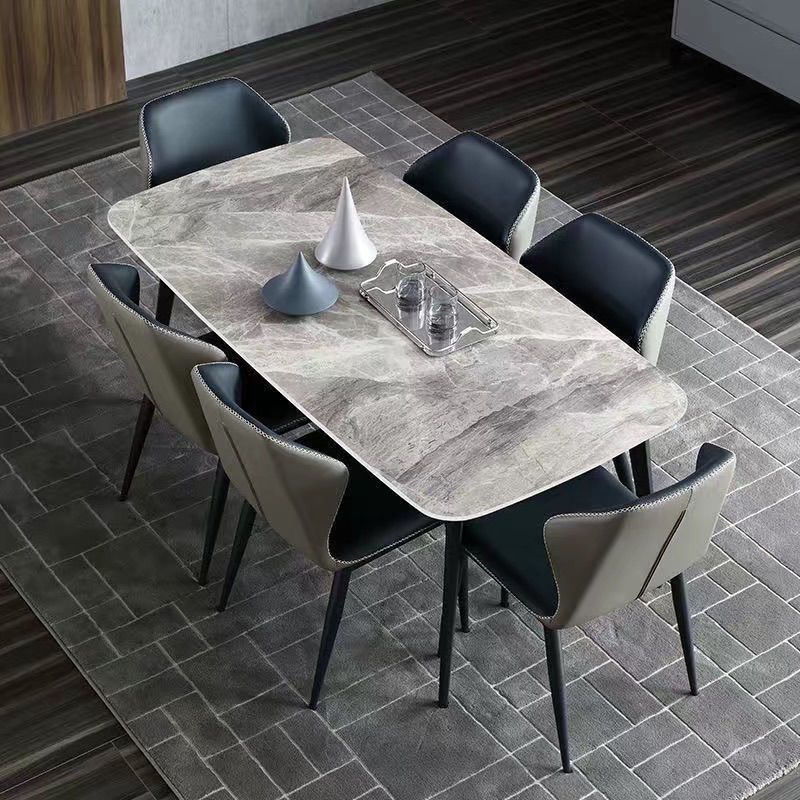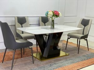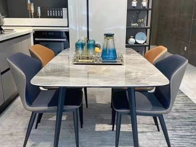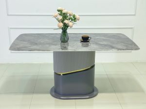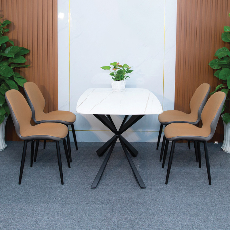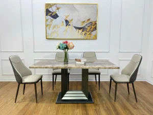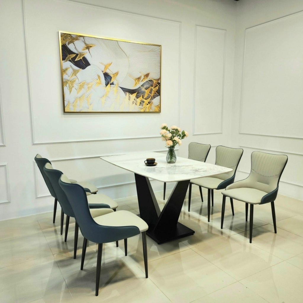 Chất liệu: bàn ăn mặt đá ceramic trắng vân xanh hoặc xám bóng chống trầy xước, chịu lực chịu nhiệt. Mặt đá bàn ăn được bo cạnh mềm mại kết hợp cùng với chân chéo tròn được làm bằng sắt sơn tĩnh điện. Mẫu bàn ăn mặt đá này có thể kết hợp cùng nhiều loại chân bàn ăn khác nhau như bàn ăn chữ X, bàn ăn chữ V, bàn ăn chữ H (Giá bán sẽ thay đổi nếu quý khách lựa chọn kiểu chân bàn khác)
