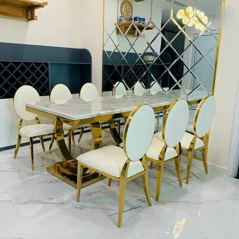 Kích thước, chất liệu của bộ bàn ăn cao cấp chân mạ PVD hiện đại: