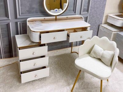 Bộ bàn trang điểm này được thiết kế với nhiều hộc tủ và ngăn kéo khác nhau. Nhờ đó bạn tha hồ đựng các loại mỹ phẩm, đồ dùng cá nhân. Với gương tròn đường kính 45cm tiện lợi cho bạn khi trang điểm. Ngoài ra bề mặt của bàn cũng rất rộng với kích thước lên tới 100x40x75cm nên có thể sử dụng để làm việc cũng vô cùng tiện lợi.
