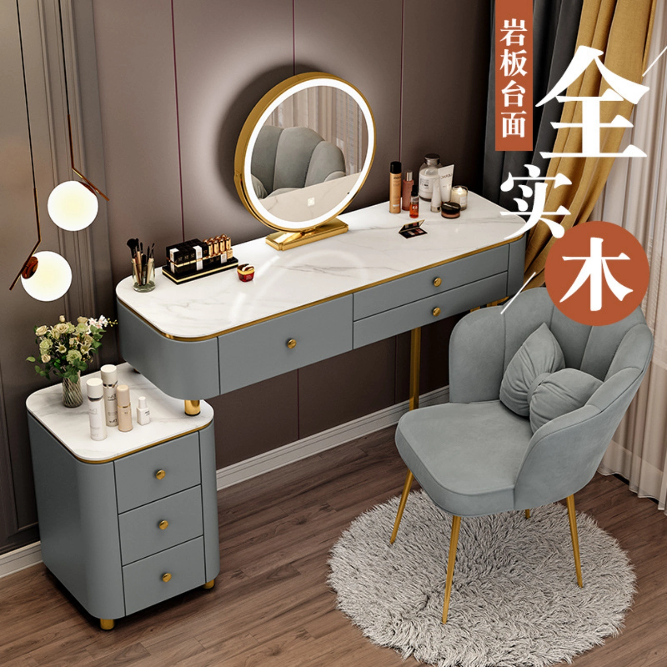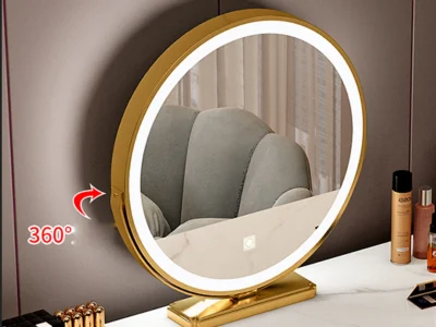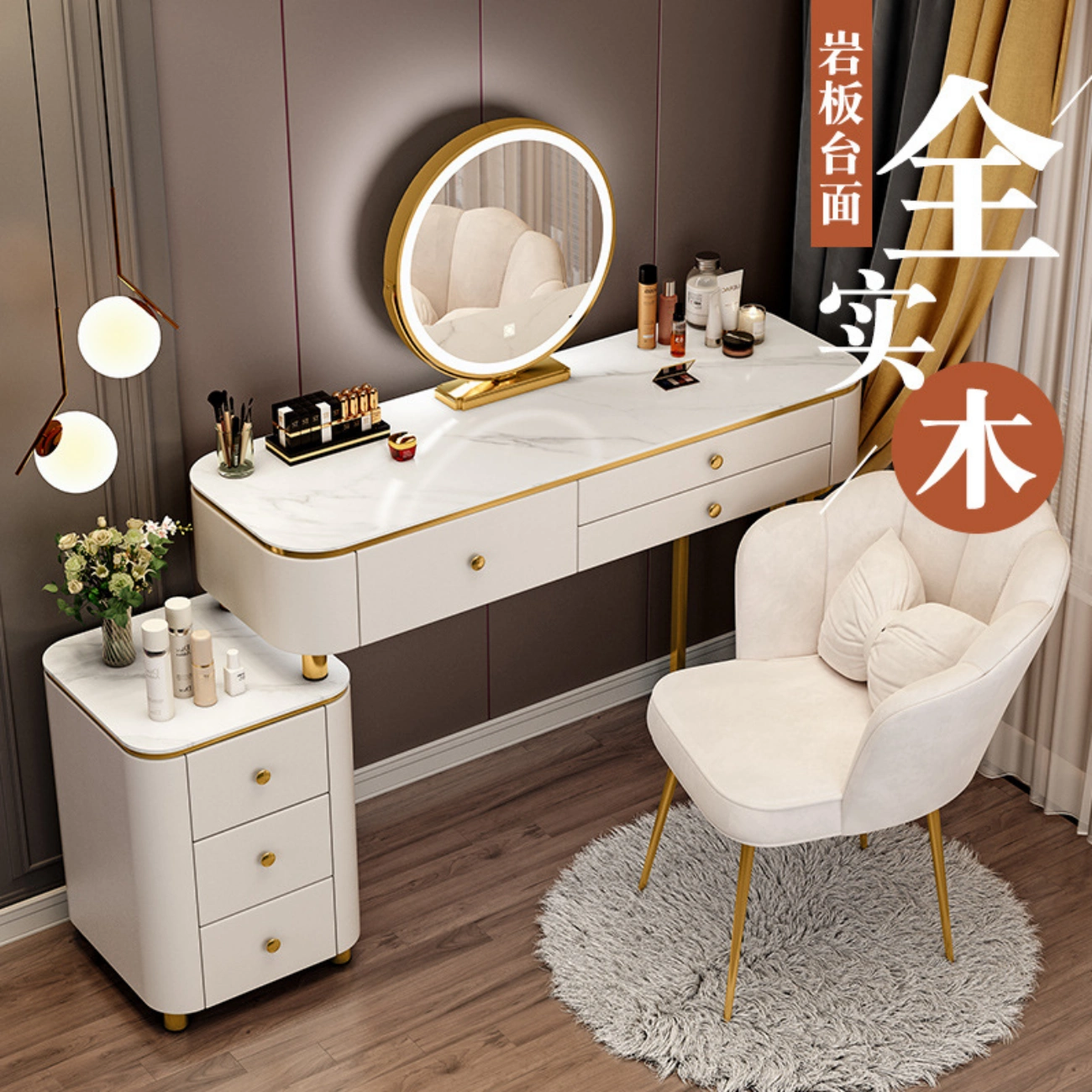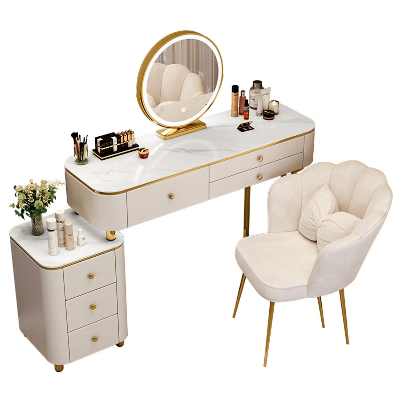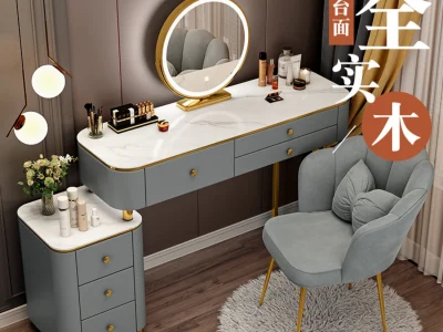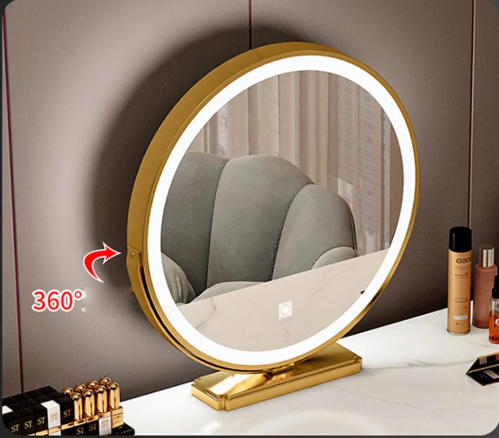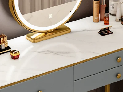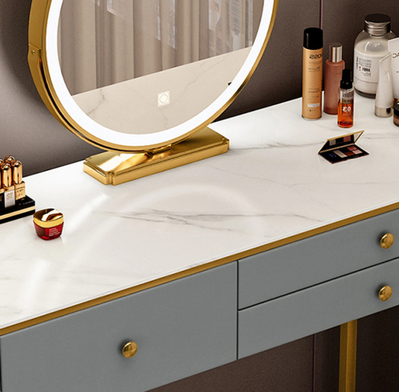 – Vật liệu: bàn trang điểm bằng gỗ sơn màu trắng bóng, Chân sắt sơn màu nhũ vàng, Ghế trang điểm bọc vải, chân sắt sơn màu nhũ vàng, Gương có đèn LED cảm ứng hiện đại, ủ Tab bằng gỗ sơn màu trắng bóng. Gương xoay 360 độ.