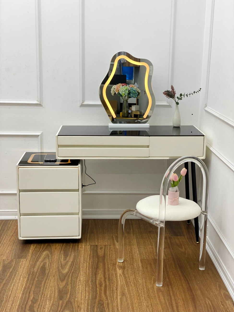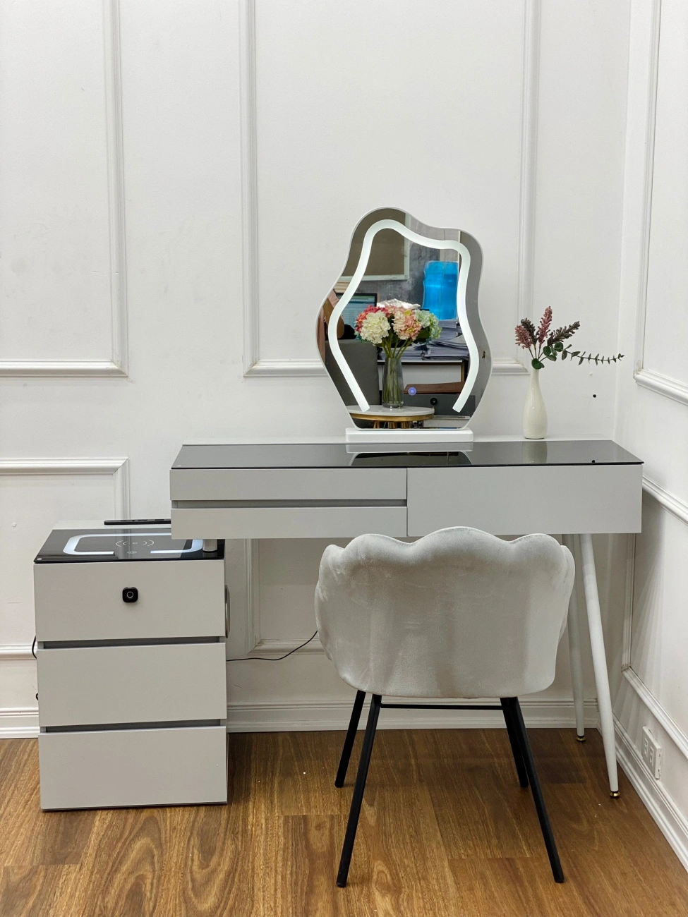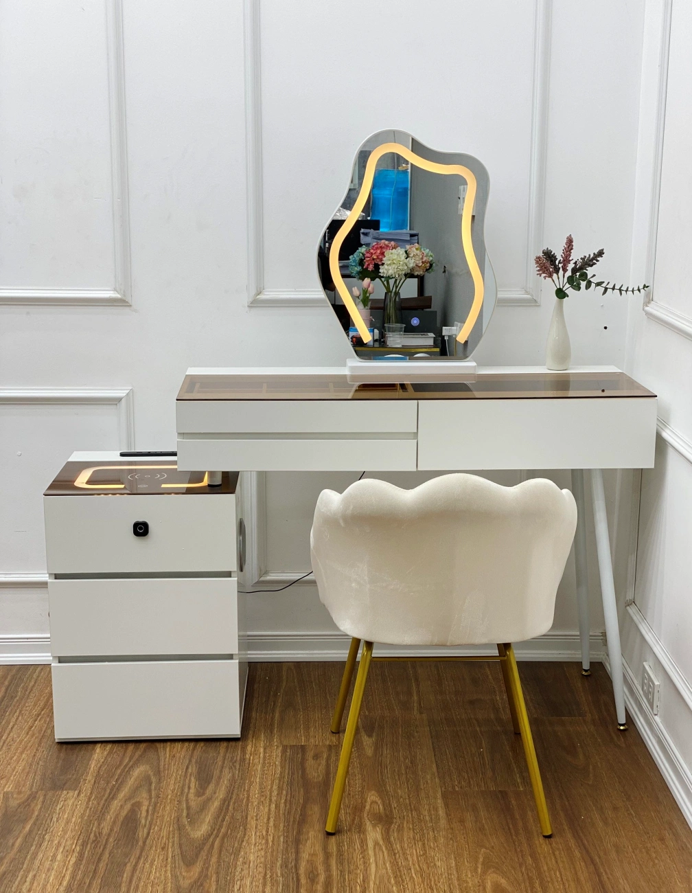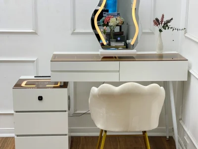 Bàn trang điểm thông minh BP008 thiết kế thông minh khi tích hợp hệ thống Sạc điện thoại không dây, đầu usb, loa bluetooth, đèn led, bảo mật vân tay giúp bàn phấn trở nên hiện đại và tinh tế hơn. Bàn phấn thông minh BP008 là một trong những mẫu bàn trang điểm dành cho phái nữ tích hợp công nghệ 4.0 được chọn mua nhiều nhất tại V68 Store.