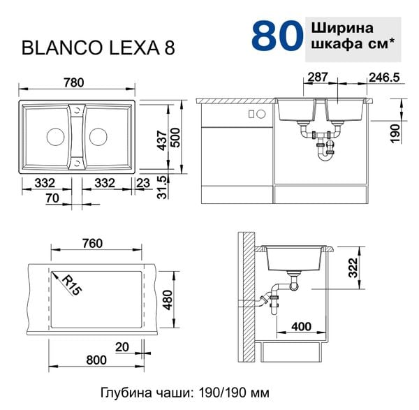 Kích thước của chậu rửa bát Blanco Lexa 8 rock grey
