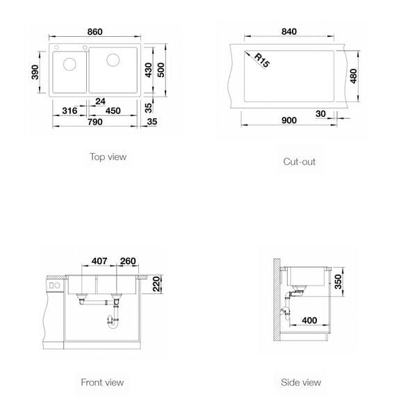 Kích thước của chậu rửa bát Blanco Pleon 9 màu xám