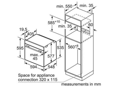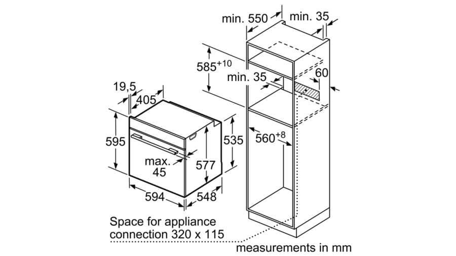 - Kích thước lắp đặt (hxwxd): 560 mm – 568 mm x 585 mm – 595 mm x 550 mm