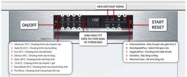 - 8 chương trình: Chuyên sâu 70 ° C, Tự động 45-65 ° C, Eco 50 ° C, Im lặng 50 ° C, Thủy tinh 40 ° C, 1 giờ 65 ° C, Rút ngắn 45 ° C, Rửa tráng 15 Phút