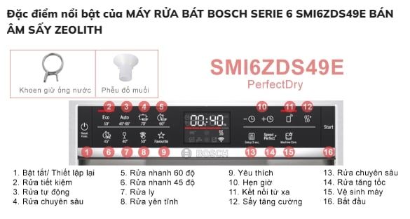 | Chương trình rửa đặc biệt | Điều khiển từ xa (Home Connect) Rửa tăng tốc (SpeedPerfect Plus) Rửa vùng chuyên sâu (Intensive Zone) Sấy khô tăng cường (Extra Dry) |