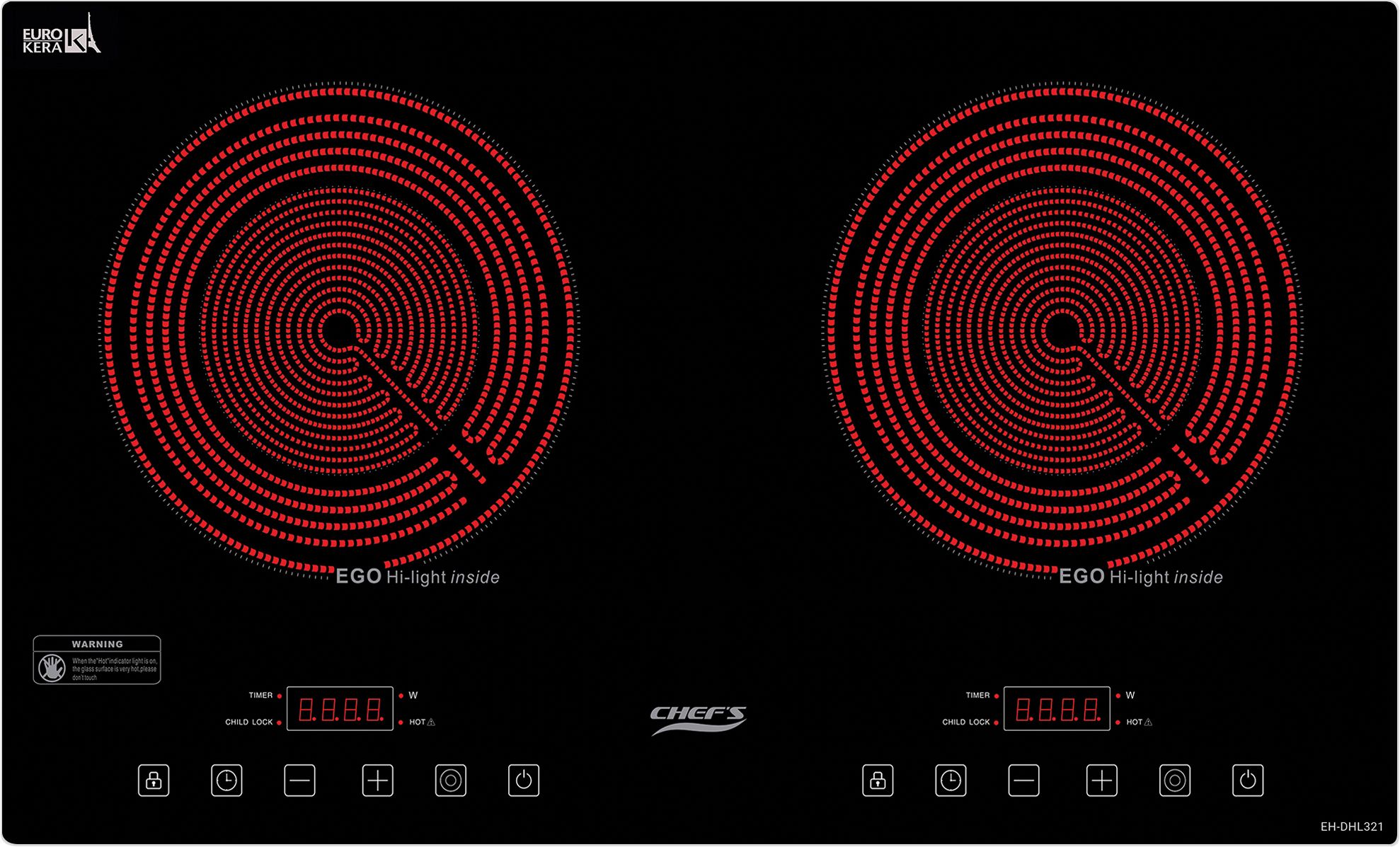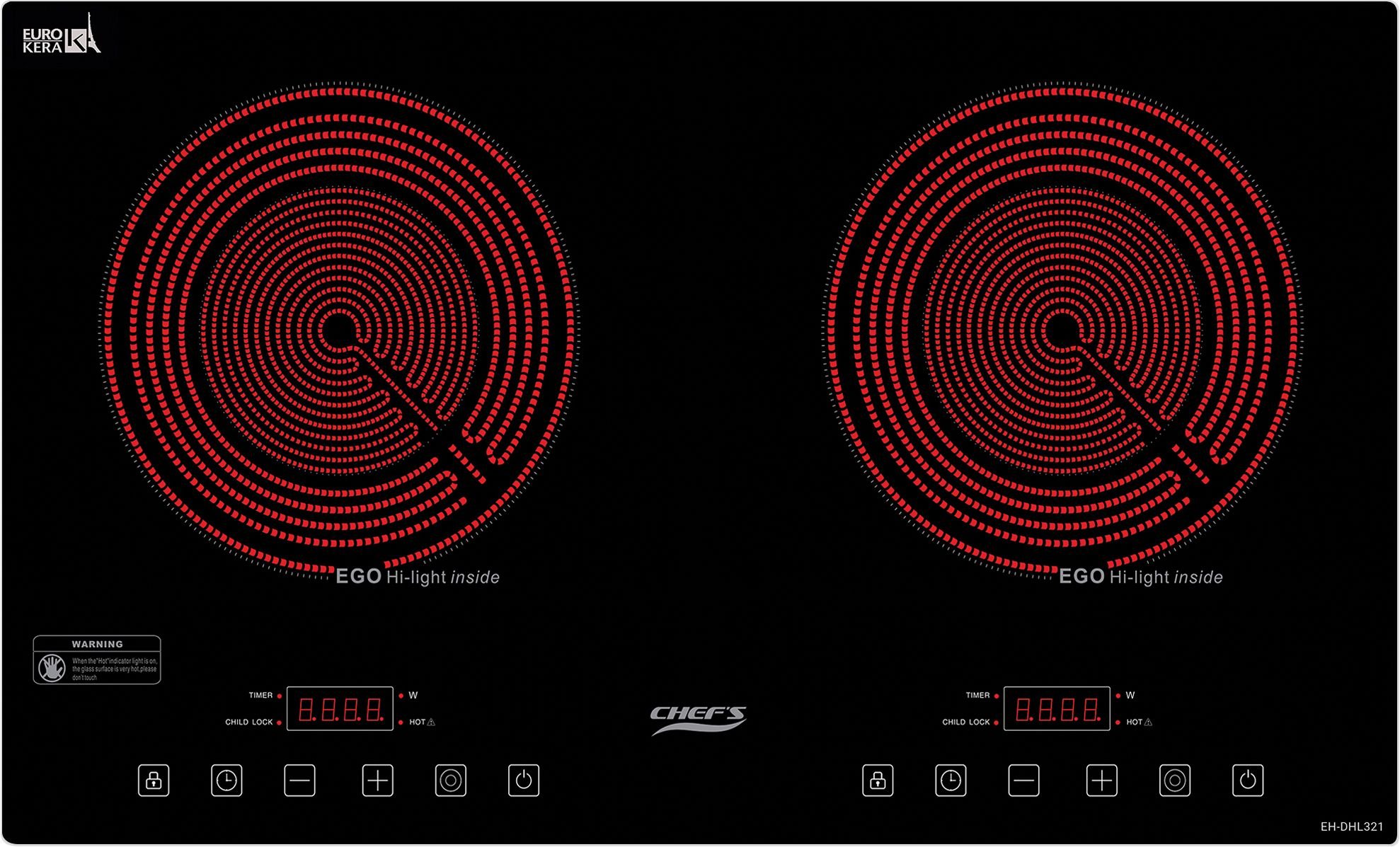 Hẹn giờ giới hạn thời gian hoạt động: Bếp hồng ngoại Chefs EH-DHL321 có khả năng hẹn giờ độc lập từng vùng nấu từ 00-8h00 phút, người dùng có thể dễ dàng thiết lập thời gian đun nấu, bếp sẽ tư động ngắt khi hết thời gian đã được cài đặt.
