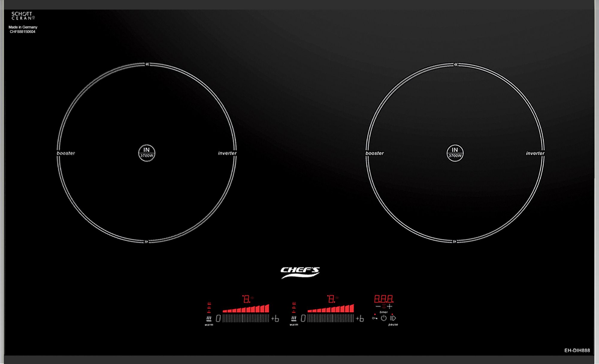 Công suất bếp từ Chefs EH – DIH888: max 4000W ( Phải: 2200W / booster 3700W, Trái 2200W / booster 3700W)