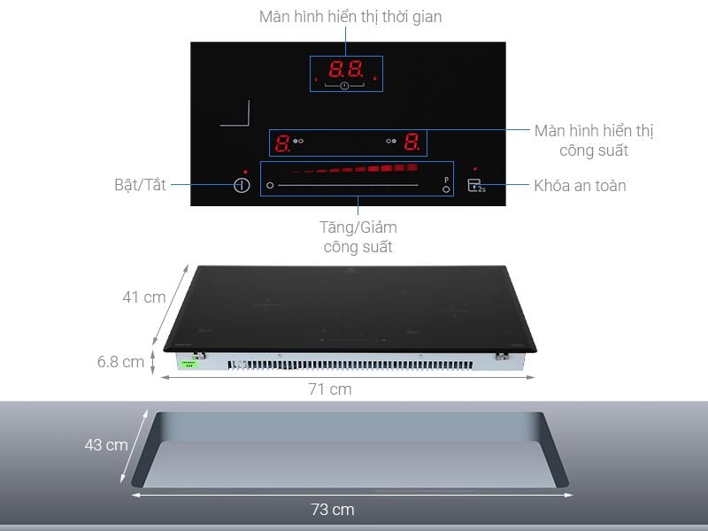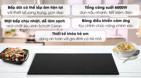 - Có chín cấp độ nấu cho mỗi vùng nấu và chức năng Bosster gia nhiệt nhanh.