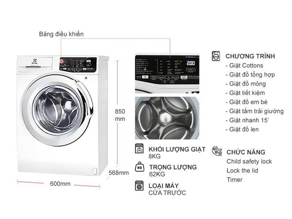 Máy giặt Electrolux Inverter 8 kg EWF8025BQWA sở hữu thiết kế hiện đại với gam màu trắng sang trọng phù hợp với mọi không gian nội thất. Với khối lượng giặt 8 kg, chiếc máy giặt thích hợp sử dụng cho gia đình có từ 3 – 5 thành viên. Không chỉ gây ấn tượng với vẻ ngoài tinh tế, chiếc máy giặt còn được trang bị nhiều công nghệ hiện đại hứa hẹn sẽ là một trợ thủ đắc lực giúp cho việc giặt giũ trở nên dễ dàng và nhanh chóng hơn. Công nghệ Inverter trên máy giặt Electrolux giúp máy giặt vận hành êm ái, tăng độ bền và tiết kiệm điện năng hiệu quả. Sở hữu chiếc máy giặt Inverter này, bạn không cần phải quá lo lắng về hóa đơn tiền điện mỗi tháng.