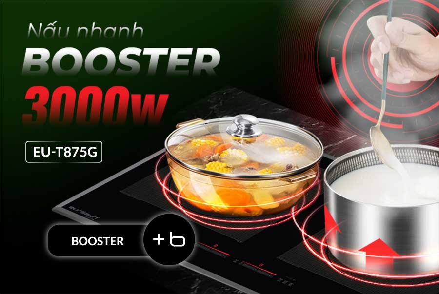 Chức năng “Booster” siêu nhanh Max 3000W giúp giảm thời gian nấu nướng. Khi bật chức năng “Booster” công suất được đẩy lên nhanh chóng giúp các công việc nấu nướng tiết kiệm thời gian và dễ dàng hơn. Tốc độ tăng nhiệt của Bếp từ EU-T875G cũng nhanh gấp 2.5 lần so với bếp truyền thống.