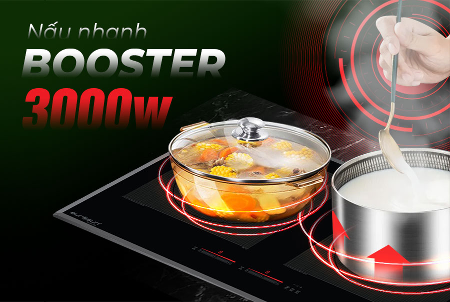 Nếu như bạn muốn nấu nhanh hơn, hãy sử dụng tính năng “Booster” siêu nhanh, chỉ nhấn nhấn và giữ 2s ở biểu tượng “booster” lúc này màn hình công suất sẽ hiển thị chữ “P” bếp có khả năng kích công suất Booster cực đại lên tới 3000W cho vùng nấu giúp công việc đun nấu trở nên nhanh chóng và tiết kiệm thời gian khi cần thiết.