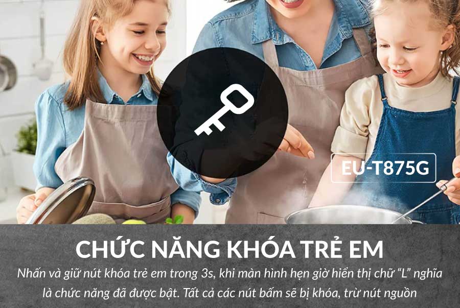Chức năng khóa trẻ em Child Lock: Nhấn và giữ phím khóa trong vòng 3 giây để kích hoạt khóa trẻ em, các phím khác sẽ không sử dụng được (trừ phím nguồn), để mở khóa nhấn và giữ phím khóa 3 giây để mở lại. Chức năng này để bảo vệ hoạt động của bếp trước các hoạt động vô tình bấm phím của trẻ em trong quá trình nấu.