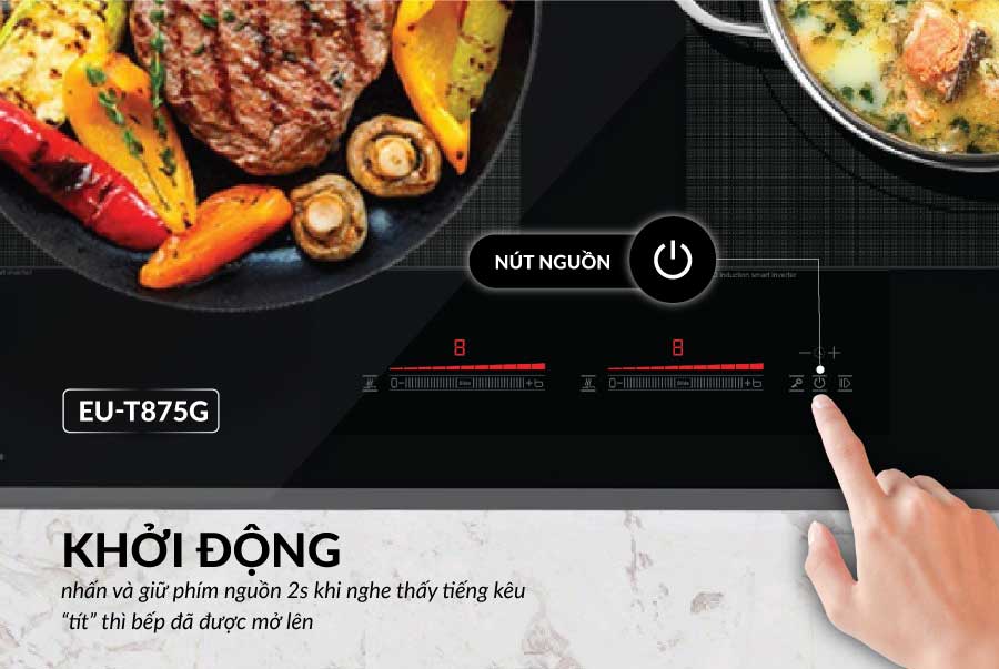 Để có thể sử dụng bếp từ ba Eu-T875G thì đầu tiên bạn phải nhấn giữ phím nguồn ở màn hình. Khi đó, bạn sẽ nghe thấy tiếng kêu “tít” thì lúc đó bếp đã được mở lên.