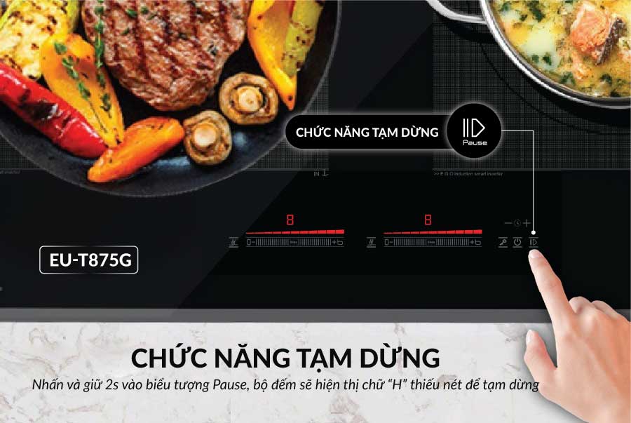 Chức năng tạm dừng Pause (Stop go): Có thể tạm dừng bếp khi đang đun nấu, sau đó ta tiếp tục đun nấu trở lại bằng việc nhấn vào thanh trượt slider hoặc phím Pause, bếp sẽ hoạt động trở lại đúng cài đặt trước đó khi được khởi chạy trở lại