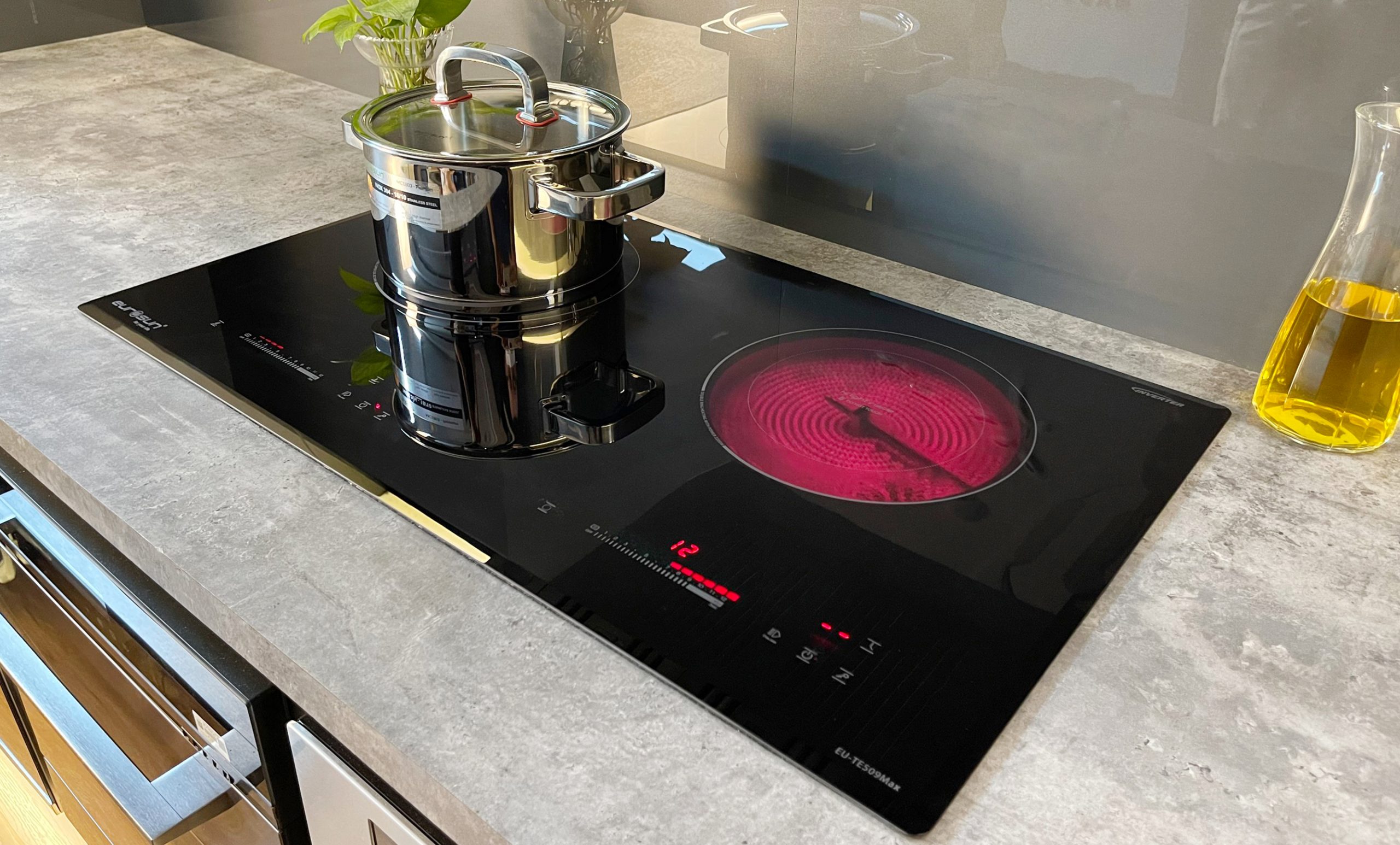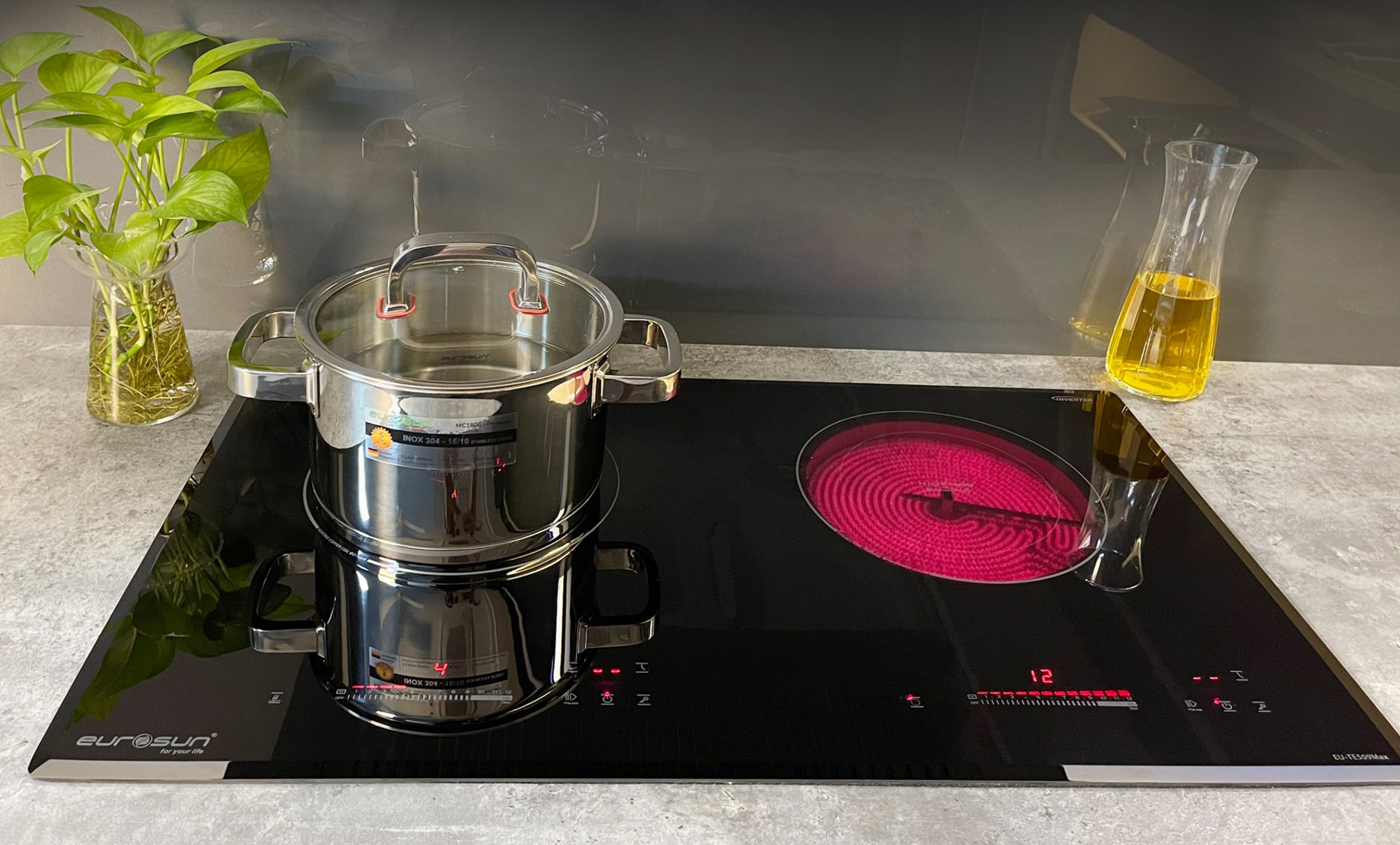 Bếp điện từ EU-TE509Max kết hợp hồng ngoại, tích hợp 2 nguyên lý trên cùng một sản phẩm. Đây là dòng bếp được nhập khẩu nguyên chiếc từ Malaysia, được người tiêu dùng tin tưởng lựa chọn. Bếp có lò trái là cảm ứng từ, lò phải là bếp hồng ngoại.