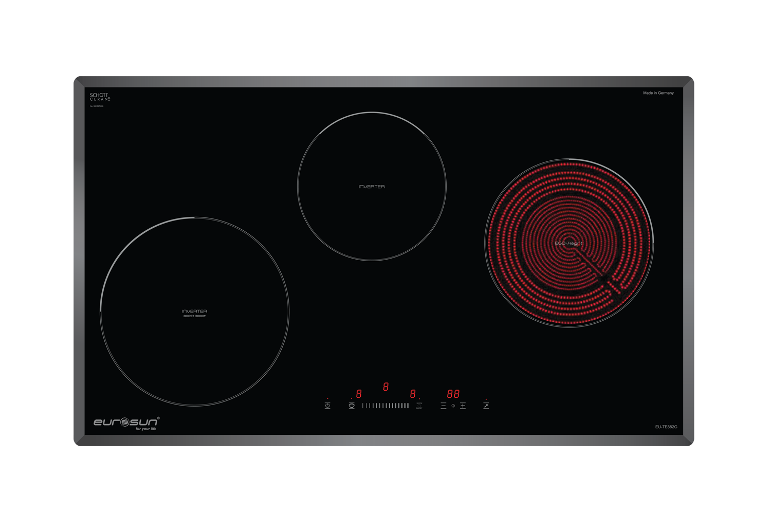 Bếp điện từ Eurosun EU-TE882G là một sản phẩm đặc biệt nổi bật với 3 vùng nấu rộng rãi, tích hợp giữa bếp từ và bếp hồng ngoại. Với thiết kế tối giản, màu sắc tinh tế, mang phong cách thời thượng Bếp từ Eurosun được các tín đồ yêu bếp đánh giá rất cao.