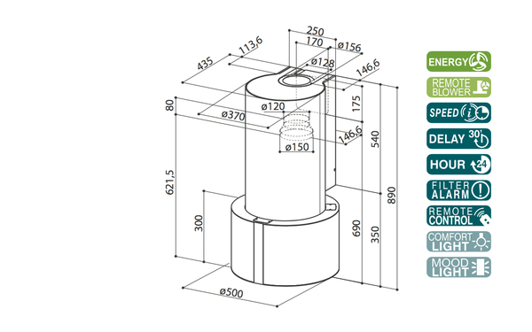 – Hút khói khử mùi FABER CASSIOPEA: Nữ hoàng tỏa sáng, kết cấu trụ truyền thống kết hợp với đèn và công nghệ cao.
