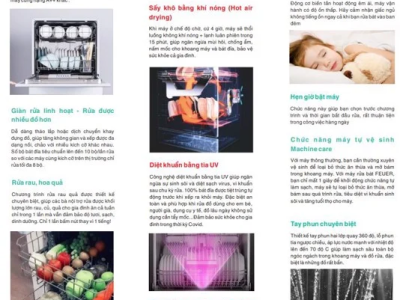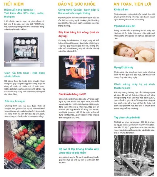 - 8 chương trình (rửa mạnh, rửa thường, tiết kiệm, rửa nhanh, đồ thủy tinh, rửa hoa quả, ngâm tráng, tự làm sạch)