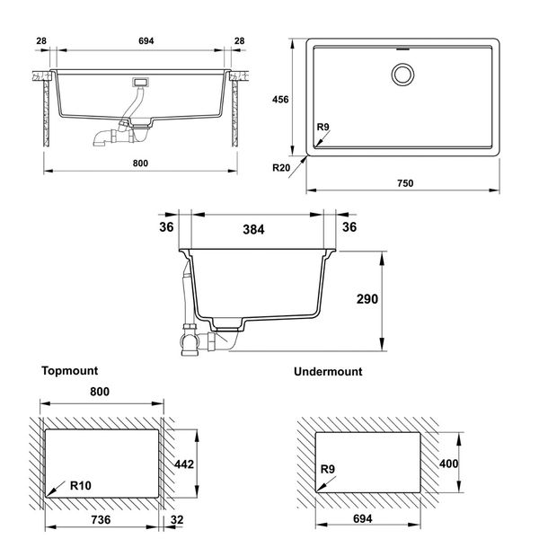 - Kích thước cắt đá âm: 736D x 442Rmm