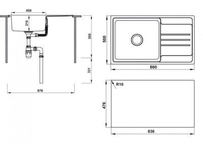 – Chậu 1 hố với bàn chờ : Chiều rộng tới 860mm