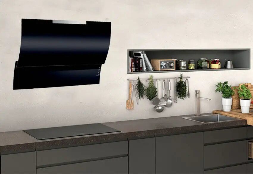 - Máy hút mùi Hafele HH-WVG80C với thiết kế kính đen uốn cong hiện đại sang trọng