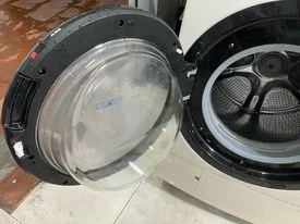 - Thiết kế đơn giản với màu trắng chủ đạo, cửa lồng giặt trong suốt