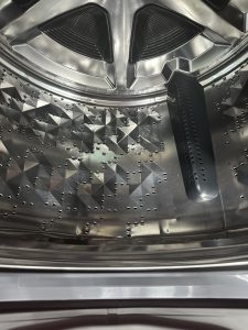 Lồng giặt được thiết kế theo kiểu lồng Sazanami, là loại lồng nghiêng. Lồng được làm từ chất liệu thép không gỉ, kết hợp với những gợn sóng thông minh và hệ thống lỗ phun nước dạng lưới, lồng giặt Sazanami giúp chu trình giặt giũ diễn ra hoàn hảo,giặt sạch vượt trội, không gây sơ vải và hư tổn cho quần áo.