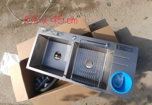 Chậu rửa bát inox 2 hố KOBESI KB 10045 Có bàn inox nano xám có cài dao và cài thớt và hố giác