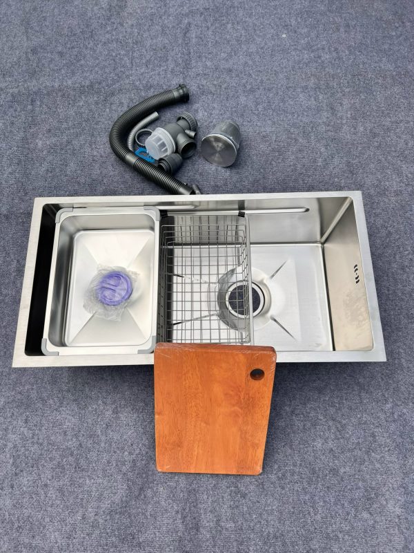- Thiết kế hiện đại với gờ hạ bậc – tích hợp phụ kiện thông minh: Siphon, giá úp bát inox, chậu rửa nhỏ, thớt inox, thớt inox lỗ , giá xà phòng.