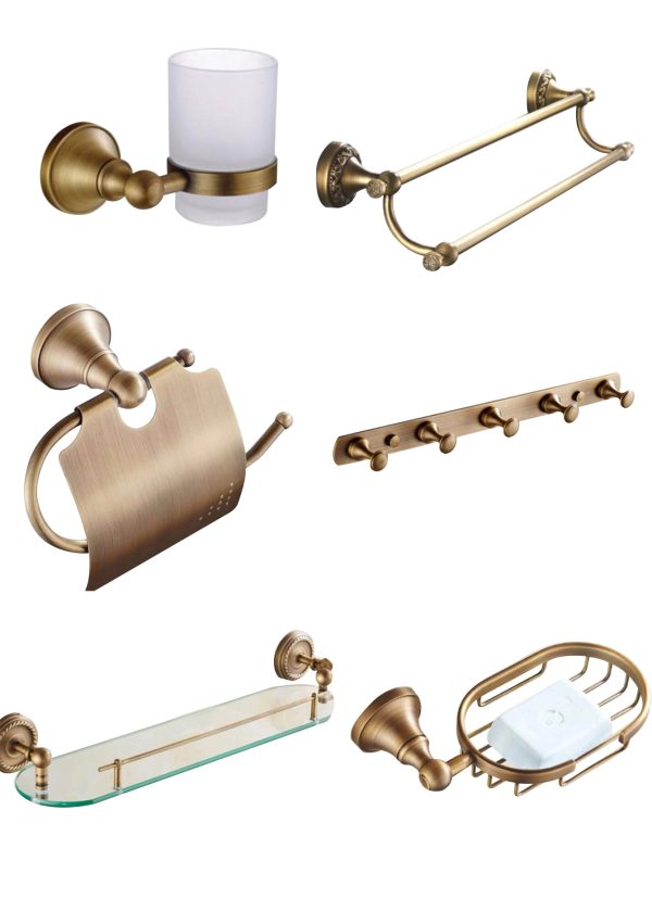 bao gồm : vắt khăn đôi , móc áo ; lô giấy ; sà phòng ; cốc đánh răng và kệ kính