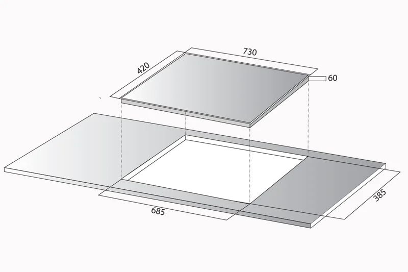 - Kích thước khoét đá: 685 x 385 mm