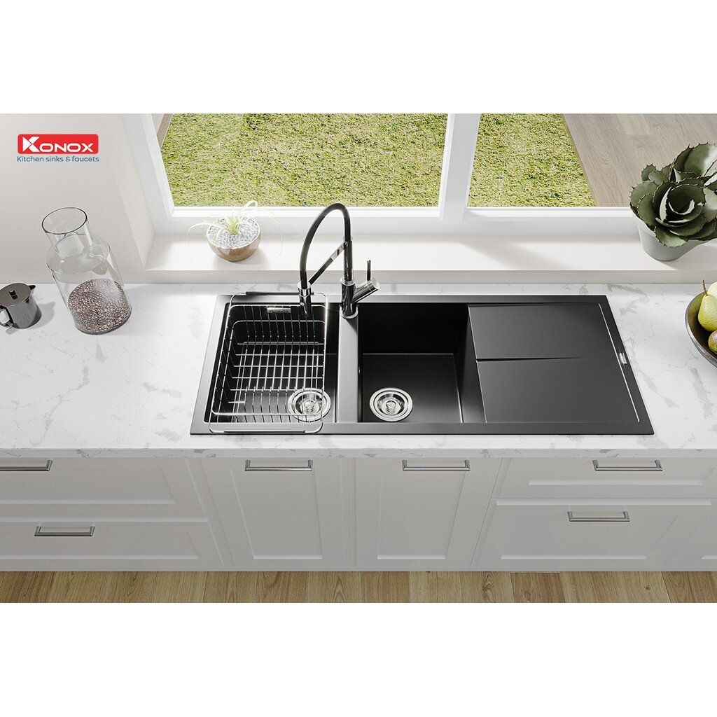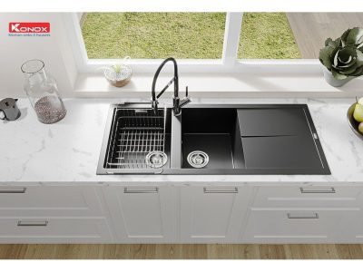 Chậu rửa bát đá Livello 1160 black nằm trong bộ sưu tập chậu vòi đá cao cấp của Konox – Kiệt tác Ý trong lòng bếp Việt. Mỗi sản phẩm là đại diện cho sự xuất sắc của Ý trong thiết kế bồn rửa, kết hợp giữa truyền thống và sự đổi mới để tạo ra một phong cách hoàn hảo nhất. Chậu đá Livello đặc biệt được sản xuất dành cho gian bếp có không gian rộng. Sản phẩm có một bàn chờ gắn liền giúp bạn có thêm không gian sắp xếp đồ bếp và rãnh thoát nước thông minh trên bàn chờ giữ cho căn bếp luôn khô thoáng tiện lợi.
