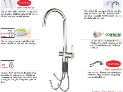 Vòi rửa Konox KN1309 được chế tạo từ hợp kim đồng 61% tiêu chuẩn Châu Âu CW617N. Model KN1309 được Konox phát triển để đáp ứng nhu cầu tích hợp 3 trong một vào vòi nước Vòi có 02 đường nước nóng lạnh + 01 đường nước lọc tương thích với các máy lọc RO. Thân vòi xoay linh hoạt 360 độ với cơ cấu khớp xoay mượt mà nhờ kết nối thân đồng tiêu chuẩn. Konox trang bị đồng bộ định hướng dòng chảy từ thương hiệu số 1 về giải pháp phụ kiện vòi nước tại Thụy Sĩ giúp tiết kiệm nước đồng thời tạo bọt khí chống bắn nước mang lại trải nghiệm tuyệt vời cho người dùng