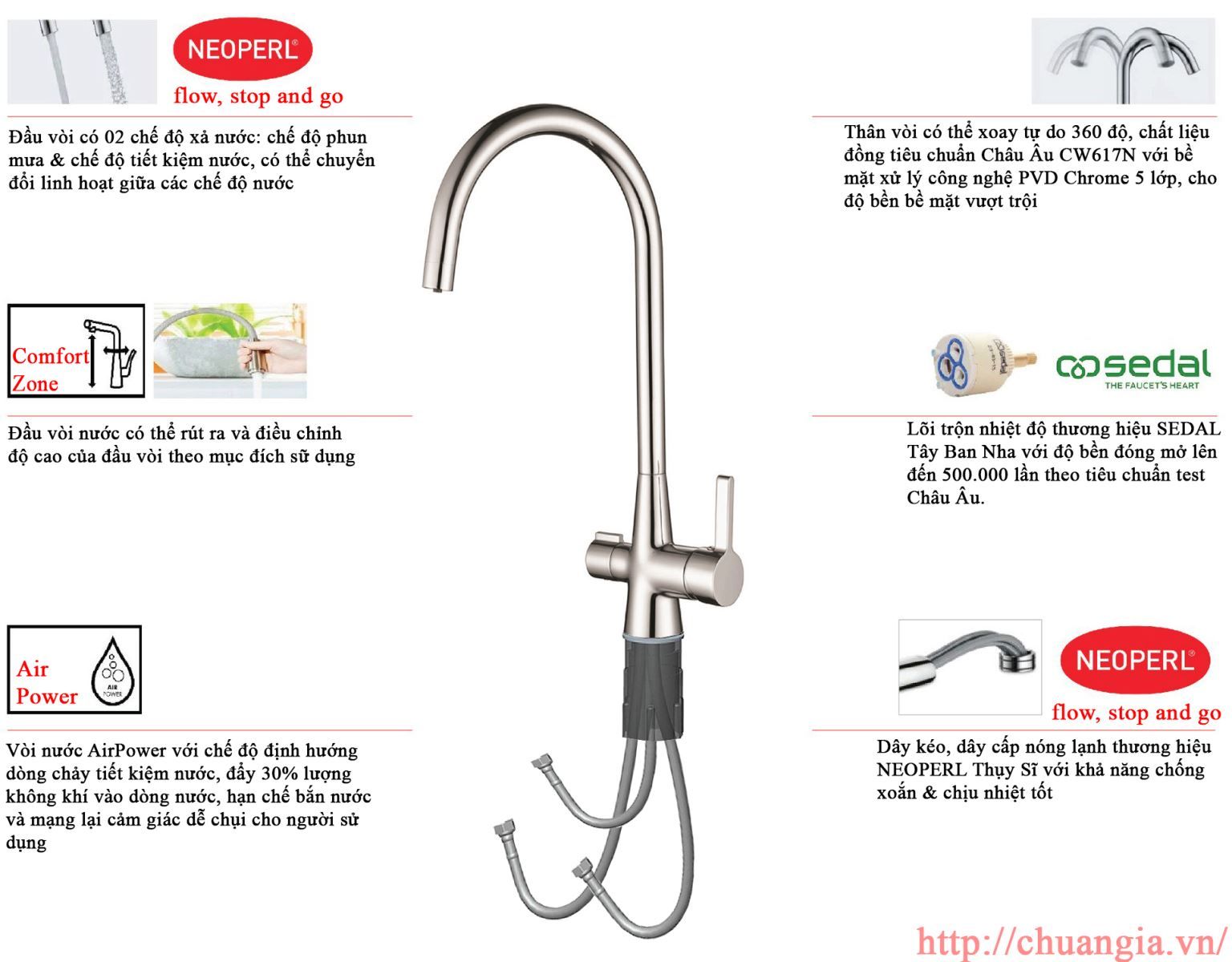 - Vòi có thêm đường nước cho máy lọc RO tích hợp cùng 2 đường nóng lạnh.