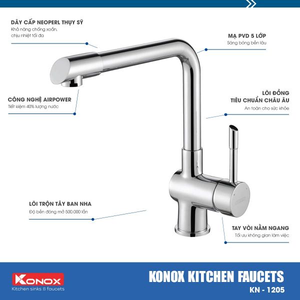 Vòi rửa bát KN1205 được Konox phát triển hướng đến một vòi bếp cơ bản, tiện dụng. Vòi rửa bát KN1205 là thiết kế cân bằng thị giác giữa thân vòi ngang khỏe khoắn và các chi tiết bo tròn mềm mại. Tổng thể hài hòa cùng bề mặt sáng bóng mang tới không gian bếp hơi thở hiện đại, sang trọng