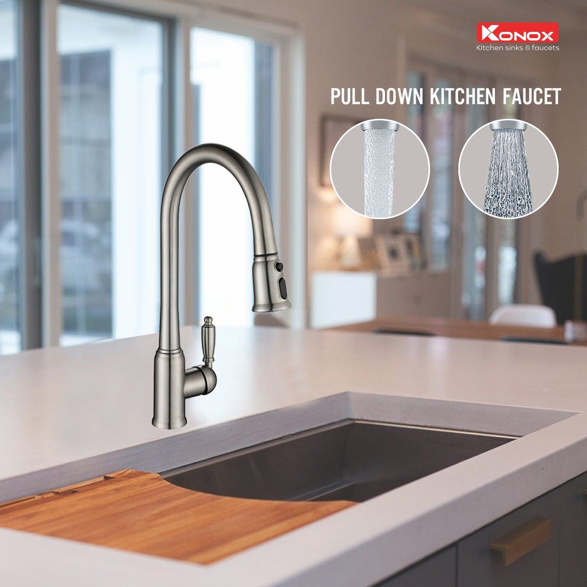 Thiết kế vòi KN1905 mang phong cách sang trọng tạo điểm nhấn trong không gian nhà bếp. Konox trang bị đồng bộ định hướng dòng chảy từ thương hiệu số 1 về giải pháp phụ kiện vòi nước tại Thụy Sĩ giúp tiết kiệm nước đồng thời tạo bọt khí chống bắn nước mang lại trải nghiệm tuyệt vời cho người dùng.