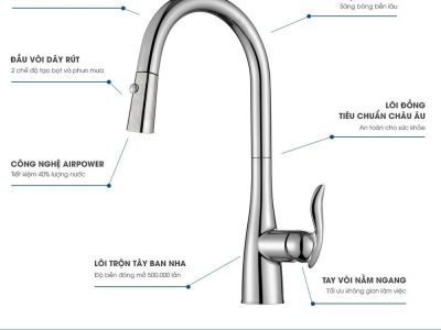 - Chức năng: Nóng lạnh + Rút dây + Đầu vòi khớp xoay + 2 chức năng Sprayer (Phun hoa sen, tạo bọt khí)