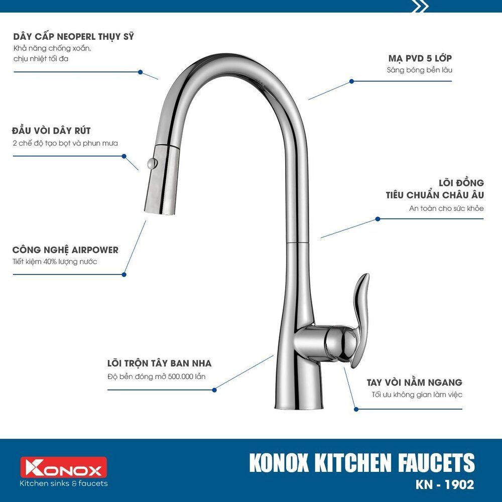 Thiết kế vòi KN1902 mang phong cách sang trọng tạo điểm nhấn trong không gian nhà bếp, phần thân vòi thiết kế cách điệu và sang trọng. Vòi có chức năng 02 đường nước nóng lạnh riêng biệt đáp ứng nhu cầu của một vòi nước hiện đại.