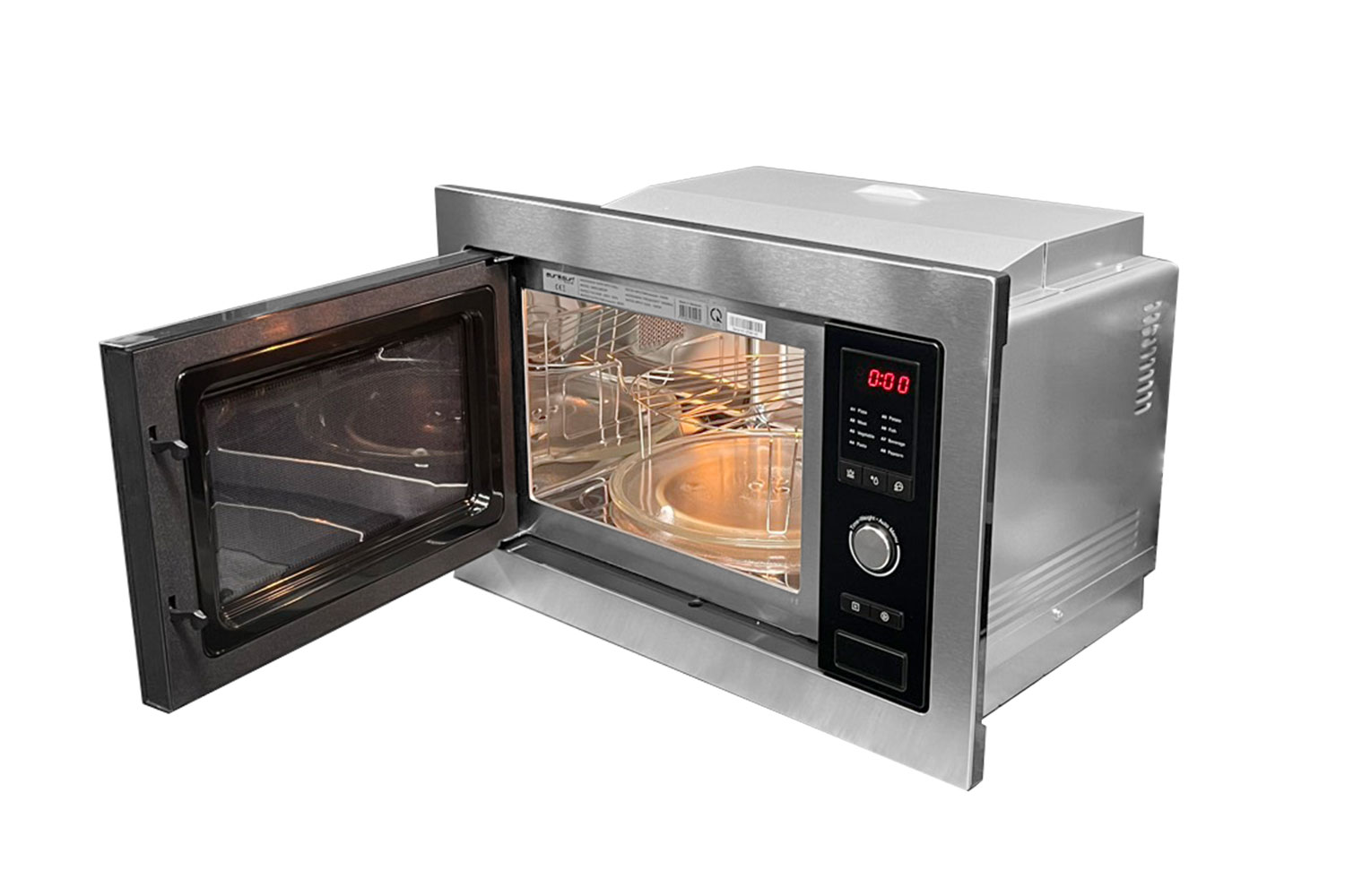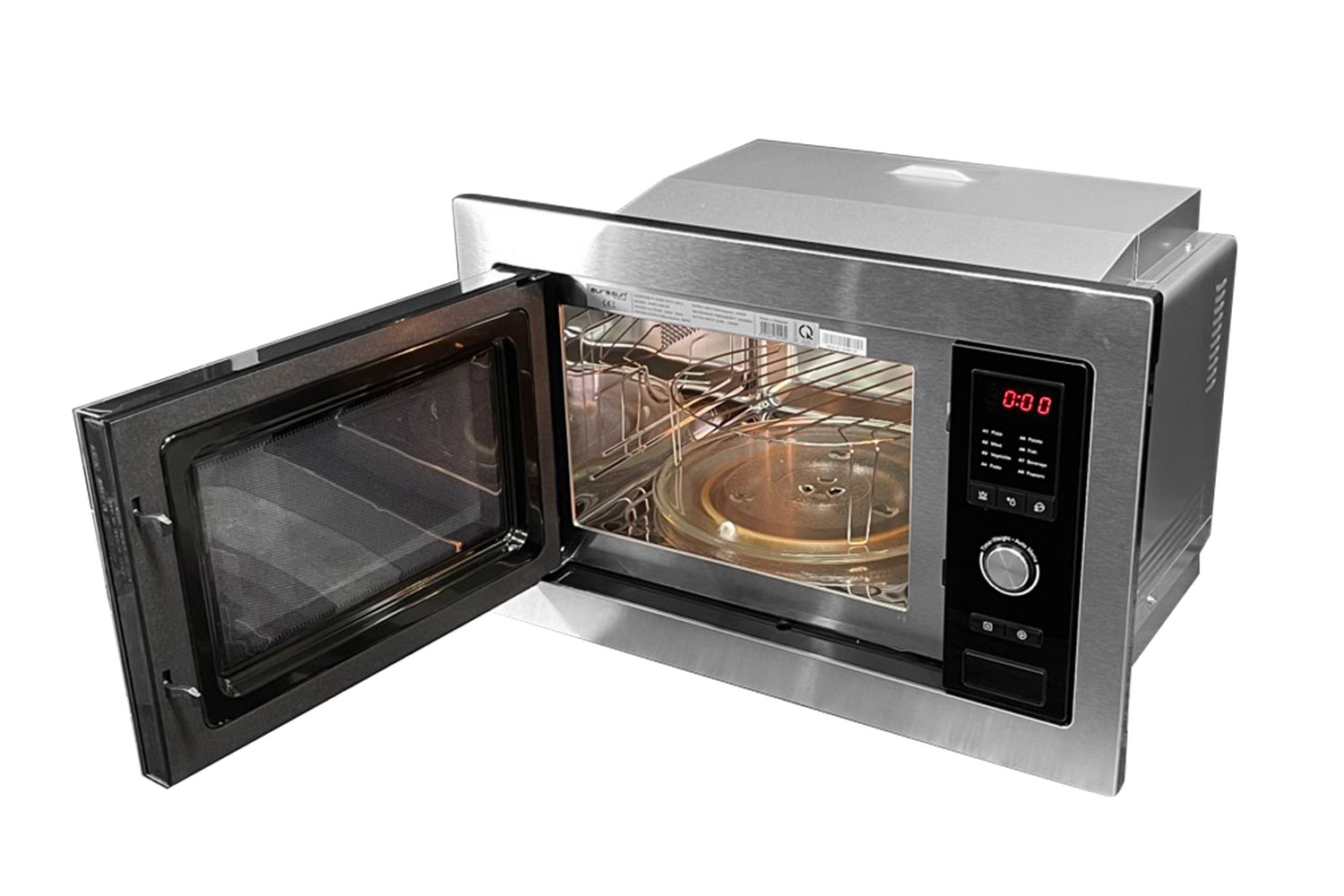 Phần thân máy làm từ chất liệu thép không gỉ không gỉ, chắc chắn, không bám dấu vân tay. Cửa lò bằng kính cường lực cao cấp màu đen có khả năng chịu lực, chịu nhiệt, giữ ổn định nhiệt độ trong khoang, độ bền cao. Khoang máy sử dụng vật liệu Inox 304 – 18/10 đảm bảo an toàn thực phẩm và dễ dàng vệ sinh. Đĩa xoay thủy tinh chịu nhiệt, đường kính 315mm làm cho thức ăn chín đều.
