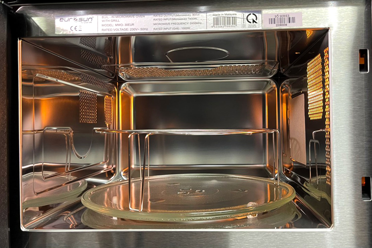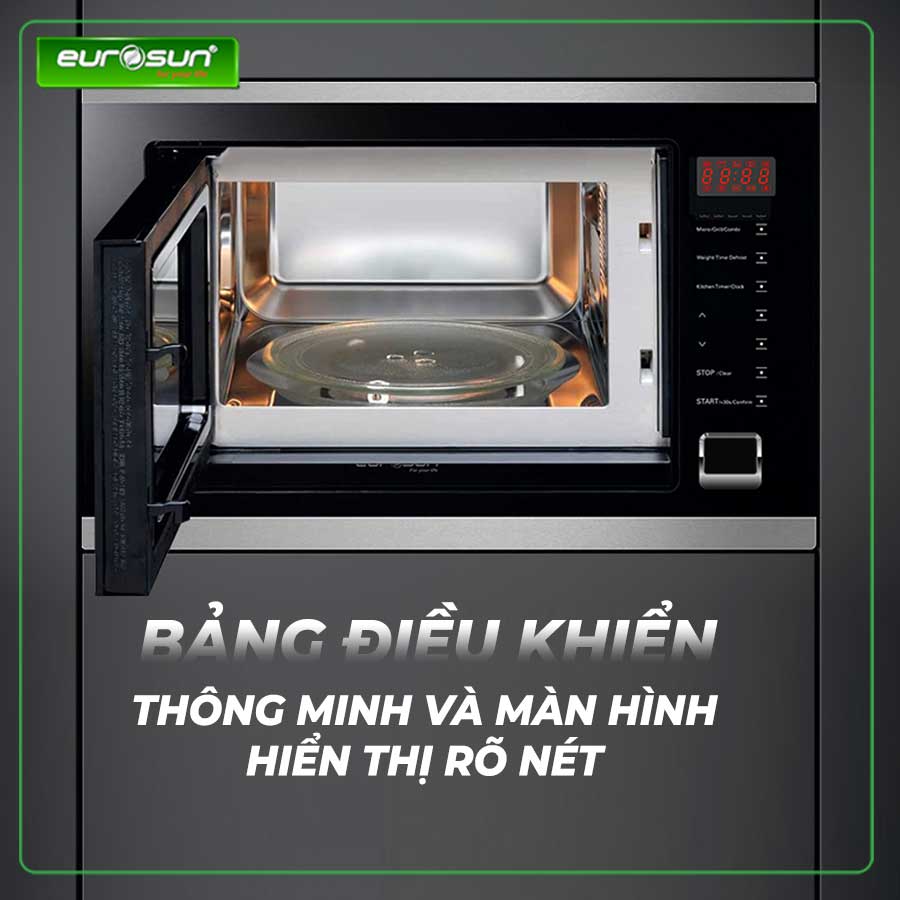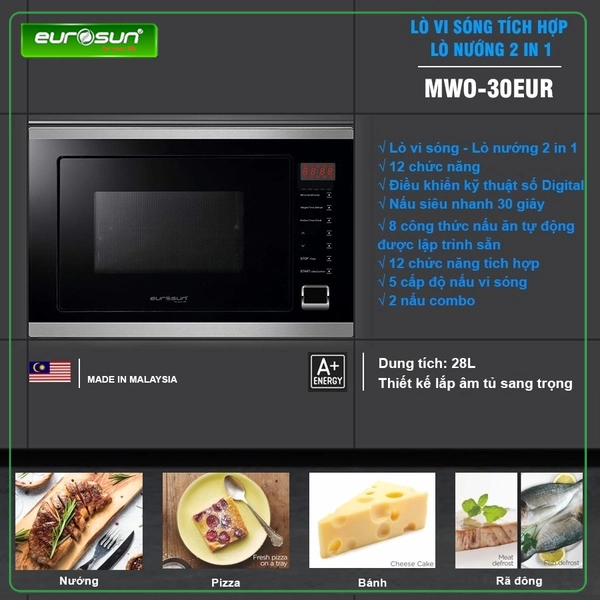 Lò vi sóng MWO-30EUR nhập khẩu nguyên chiếc từ Malaysia là sản phẩm lò vi sóng cao cấp 2 trong 1 (vi sóng và nướng kết hợp) dung tích 28L sử dụng thoải mái cho đại đa số gia đình Việt. Lò vi sóng Eurosun MWO-30EUR có thiết kế sang trọng, sử dụng vật liệu cao cấp nhất trong ngành thực phẩm là Inox 304 (18/10) kết hợp kính cường lực đen chống bám bẩn và vân tay, tạo vẻ ngoài sang trọng và cuốn hút. Lò có hệ thống quạt tự làm mát hiệu quả