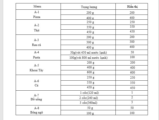 Ghi chú: Thời gian nấu khác với hệ 24 giờ. Thời gian nấu là đặt giờ.