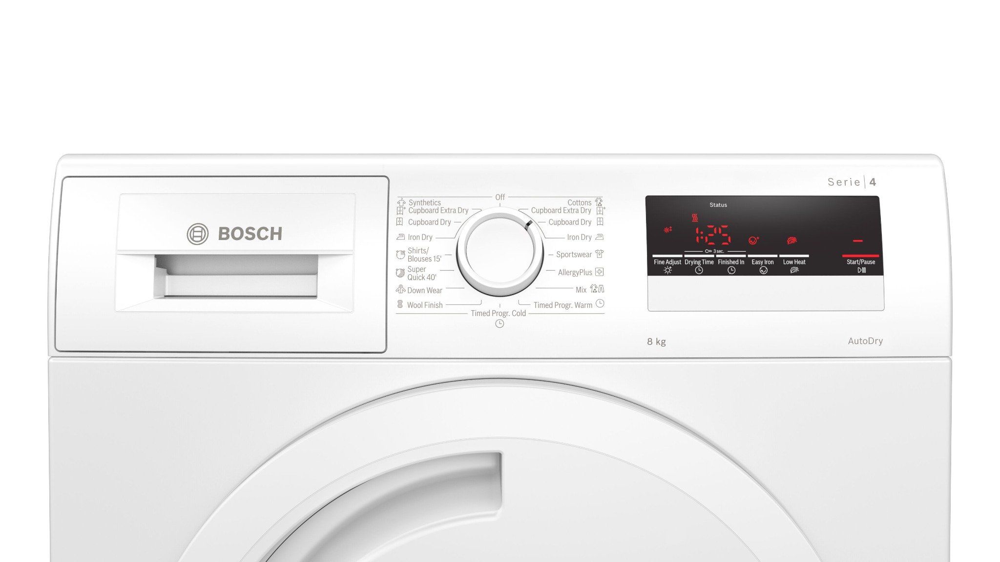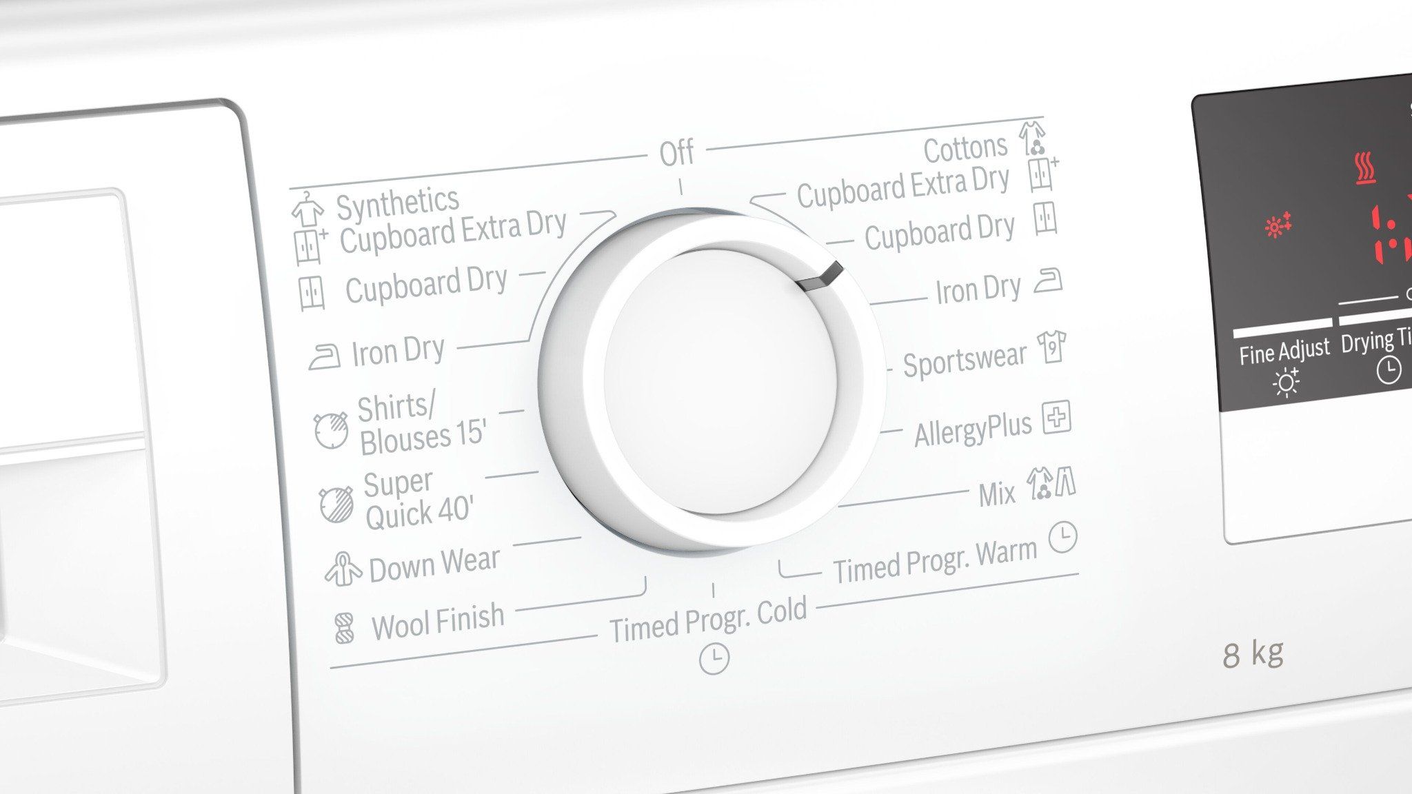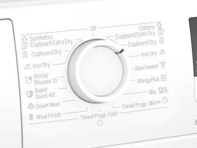 - Chương trình: Cottons Cupboard Extra Dry, Cottons Cupboard Dry, Cottons Iron Dry, Sportswear, AllergyPlus, Mix, Timed program warm, Timed Programe cold, Wool Finish, Down Wear, SuperQuick 40′, Shirts/Blouses15′, Synthetics Iron Dry, Synthetics Cupboard Dry, Synthetics Cupboard Extra Dry