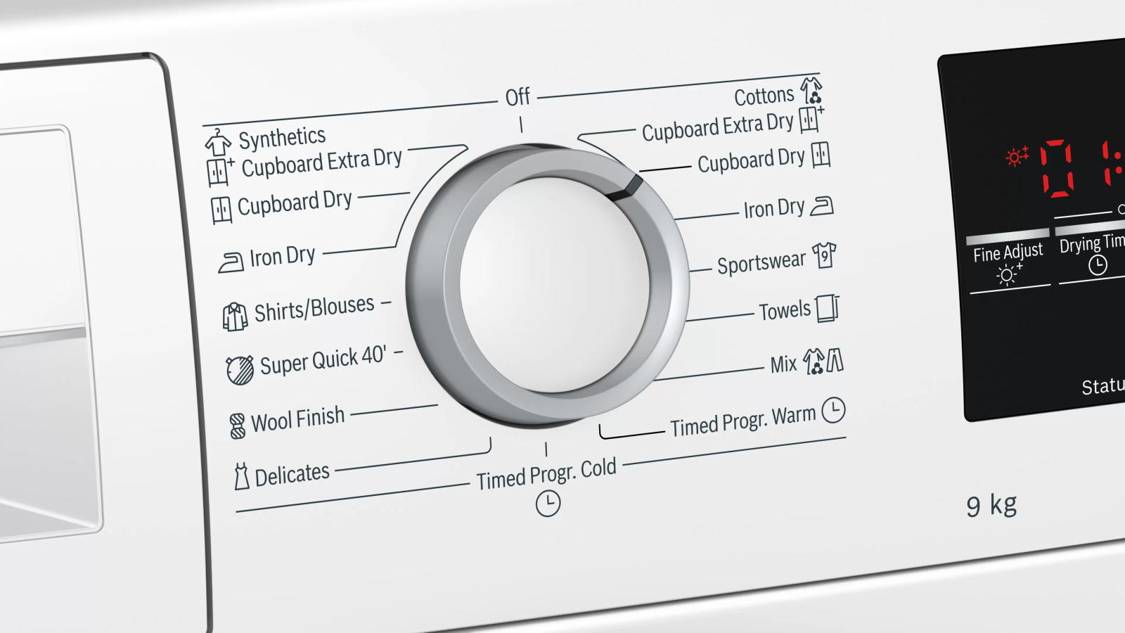 - Các nút cảm ứng: basic settings, end of program delay, easy ironing, memory 1, memory 2, setting / selection options, on / off, delayed start, start / reload / pause, degree of drying, 24 hours delay of program end