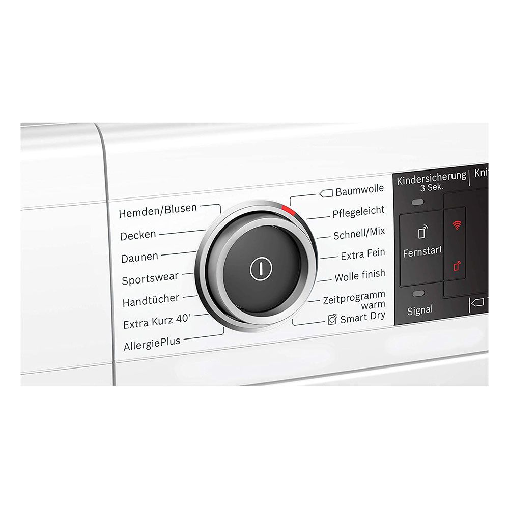 Các nút cảm ứng: Ready in, crease protection 60 min., Crease protection 120 min., Child lock 3 seconds, on / off, remote start, gentle drying, signal, start / reload / pause, degree of dryness fine adjustment, dryness target, 24 h ready in