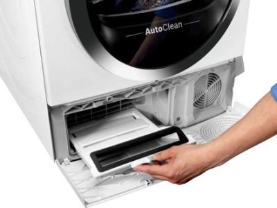 | AutoClean: Tự động loại bỏ lông và bụi vải Nó thay thế bộ lọc ở cửa bằng công nghệ tự lọc sau mỗi lần sấy. Công nghệ này tự động thổi các sợi vải và lông vào phần dưới thiết bị. Các sợi lông này được ngưng tụ ở một bộ phận đặc biệt và được làm sạch sau mỗi 20 chu trình sấy. |