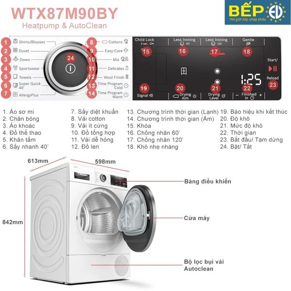 - Máy sấy Bosch WTX87M90BY: sử dụng công nghệ Heat Pump sấy bằng khí nóng tiên tiến nhất