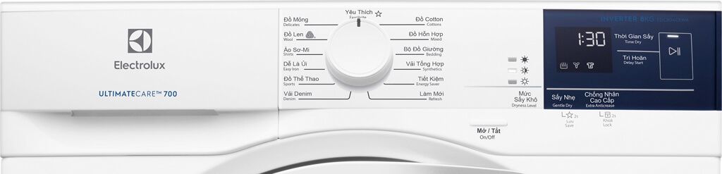 Máy sấy trang bị dàn điều khiển có màn hình LED, núm xoay cảm ứng thông minh và ngôn ngữ tiếng Việt to rõ sẽ giúp bạn dễ dàng thao tác, điều khiển, phù hợp với cả người lớn tuổi.