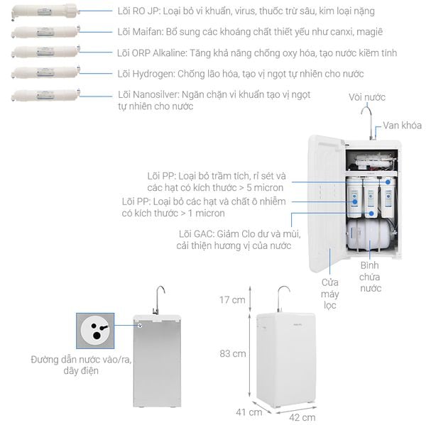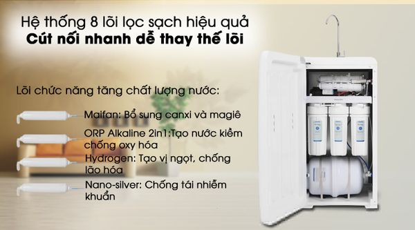 Hệ thống 8 cấp lọc cho nước đầu ra sạch trong, tinh khiết, bổ sung thêm khoáng chất tốt cho sức khỏe